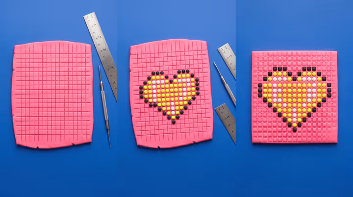 A bead grid pattern in polymer clay has the same appeal as cross-stitch on fabric: each unit reads as a discrete pixel, the grid math is visible, and the color placement creates the picture. The technique fails when the beads drift in size, the rows wander, or the bake shifts the alignment.