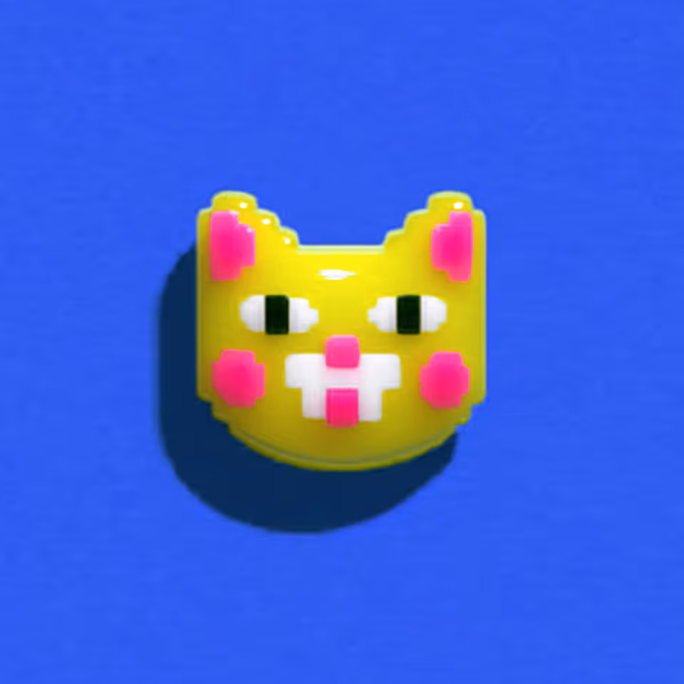 Yellow Pixel Cat Brooch. Start with one yellow cat-face plaque and keep the cheeks, ears, and muzzle as separate pieces, because the pair reads as a flat badge with layered facial…