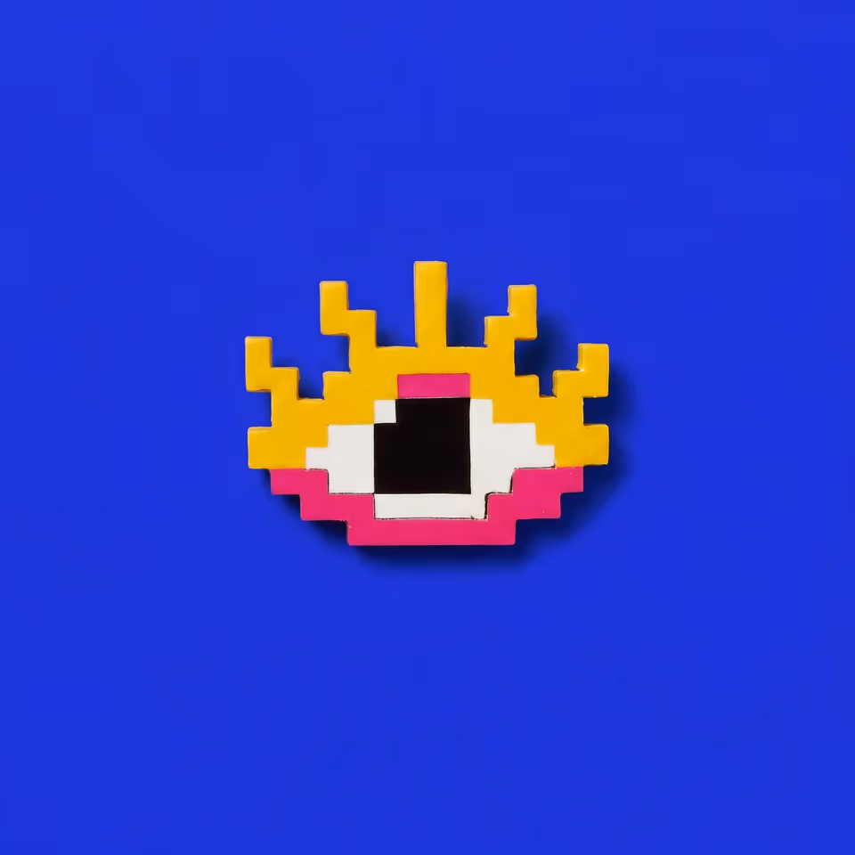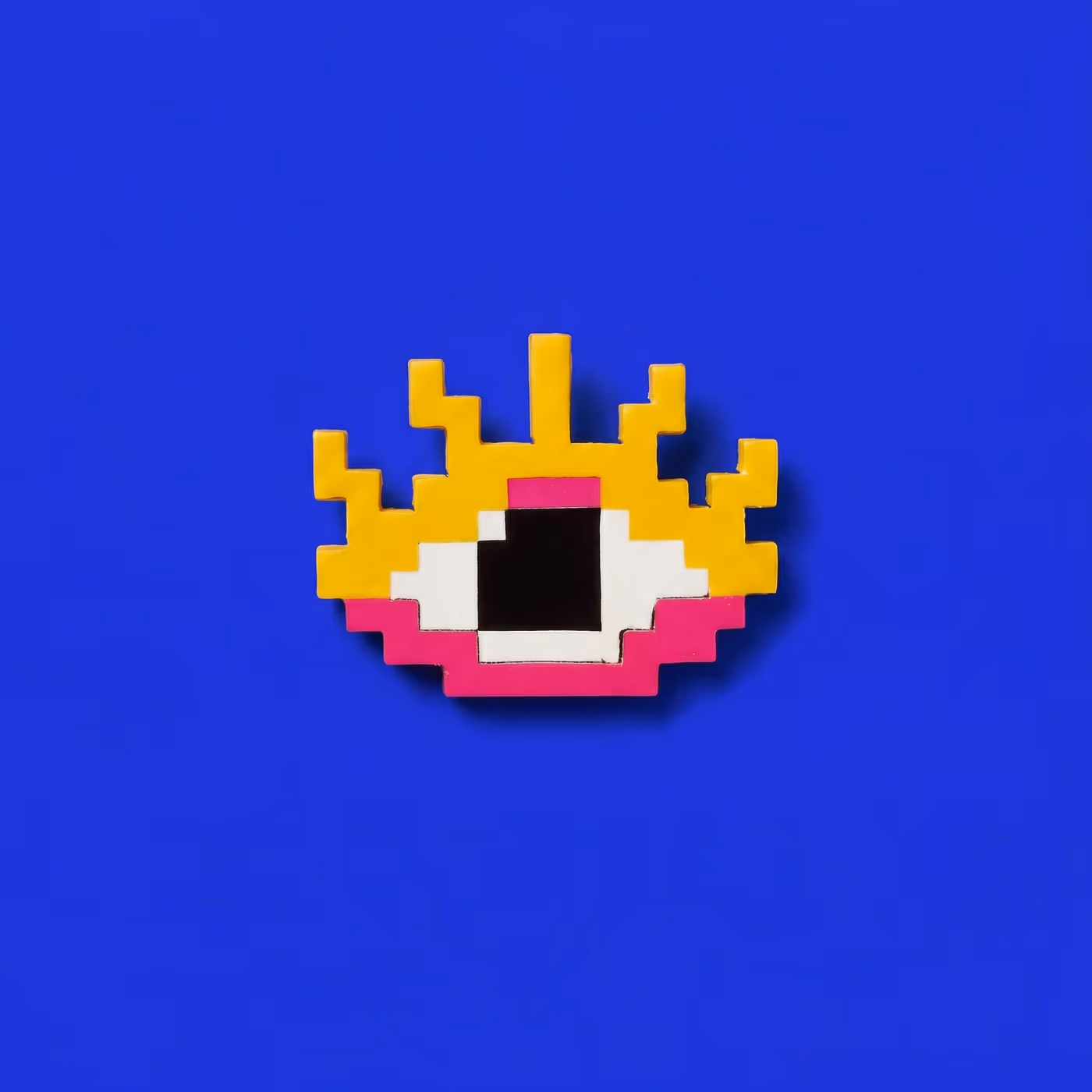 Start with one thick yellow eye plaque and cut the whole stepped silhouette first, because the pair reads like a layered pixel badge rather than a printed graphic. Add the white sclera blocks, square black pupil, and hot-pink lower lid on top, then keep the back flat for a brooch finding after cure.