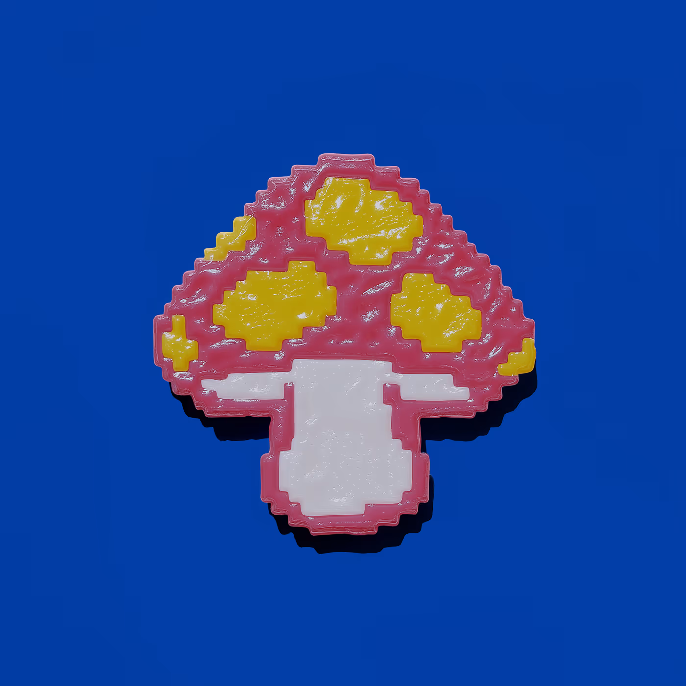 Pink Pixel Mushroom Brooch. Start with the pink mushroom silhouette first, because the cap outline and white stem do the real work here, not any domed sculpting. Once the base sha…
