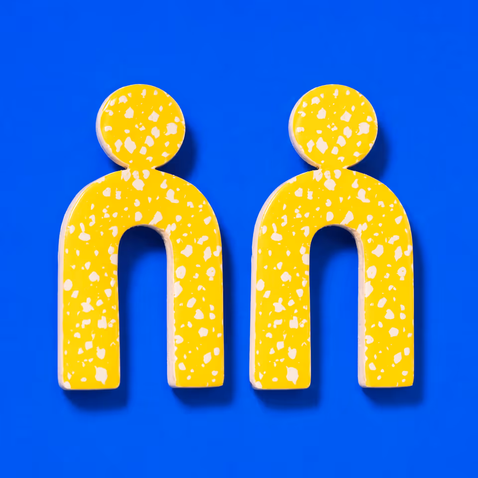 Yellow Polymer Clay Speckled Cutout Arch Drop Earrings. Treat the open arch as the main structure and the speckles as surface character. Mix or place the white flecks before cutti…